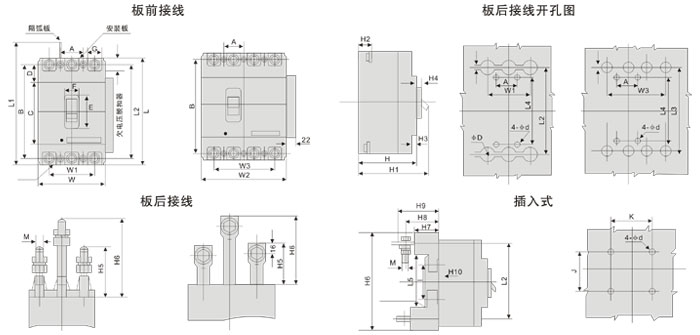 按產(chǎn)品極數(shù)分為二極、三極與四極,四極產(chǎn)品中中性極(N極)的型試分四種: A型:N極不安裝過(guò)電流脫扣器,且N極始終接通,不與其它三極一起合分; B型:N極不安裝過(guò)電流脫扣器,且N極與其它一極一起合分(N極先合后分); C型:N極安裝過(guò)電流脫扣器,且N極與其它三極一起合分(N極先合后分); D型:N極安裝這電流脫扣器,且N極始終接通,不與其它三極一起合分。 按額定電流分: GM1-63為(6)、10、16、20、25、32、40、50、63A九級(jí)(6A規(guī)格無(wú)過(guò)載保護(hù)) GM1-100為(10)、16、20、25、32、40、50、63、80、100A十級(jí); GM1-160為100、125、140、160A四級(jí); GM1-225為100、125、140、160、180、200、225A七級(jí); GMl-400為225、250、315、350、400A’~’級(jí); GM1-630為400、500、630A三級(jí); GM1-800為630、700、800A三級(jí); 按接線方式分:板前接線、板后接線、插入式接線三種。 按過(guò)電流脫扣器型式分熱動(dòng)—電磁(復(fù)式)型、電磁(瞬時(shí))型兩種。 按斷路器有無(wú)附件分帶附件和不帶附件兩種。 |